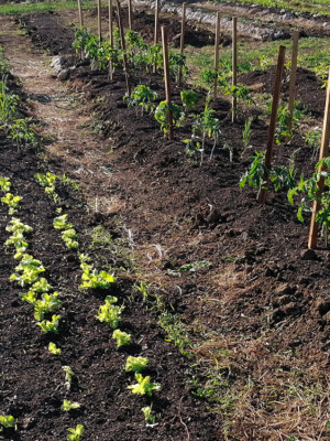 Közben megjött jóadag komposzt is, így a kert is szépült, plusz karók is kerültek a palánták mellé!
