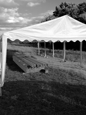 Felállt az 50m2-es sátor is, betontalpakkal rögzítve, hogy ne fújja el a szél. A kisebbik sátor is áll, jelenleg tárolóként használjuk.