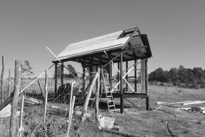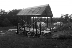 A második hétvégén fölkerült az alapvázra a teljes szerkezet, a tető váza. Mondtam Ádámnak, aki az ácsmunkát vezette, és mellesleg matematikus hallgató az ELTÉ-n, hogy már bekerült az öröklétbe, mert ez a tároló legalább ezer évig fog állni, köszönhetően többek közt