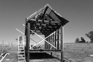 Szóval a csapat két napon keresztül látástól vakulásig dolgozott, s sikerült is az egyik oldalfalat felszögelni, meg a tetődeszkákat, a tetőn kihagyva a csatorna vasak helyét, a falakon meg a szarufák alatti léceket, mert azok némi igaztásra szorulnak, be kell szabni őket a helyükre a szarufák alá.