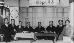 Balról jobbra: Toyama Kanken, Otsuka Hironori, Shimoda Takeshi, Gichin Funakoshi, Motobu Choki, Kenwa Mabuni, Genwa Nakasone és Taira Shinken.